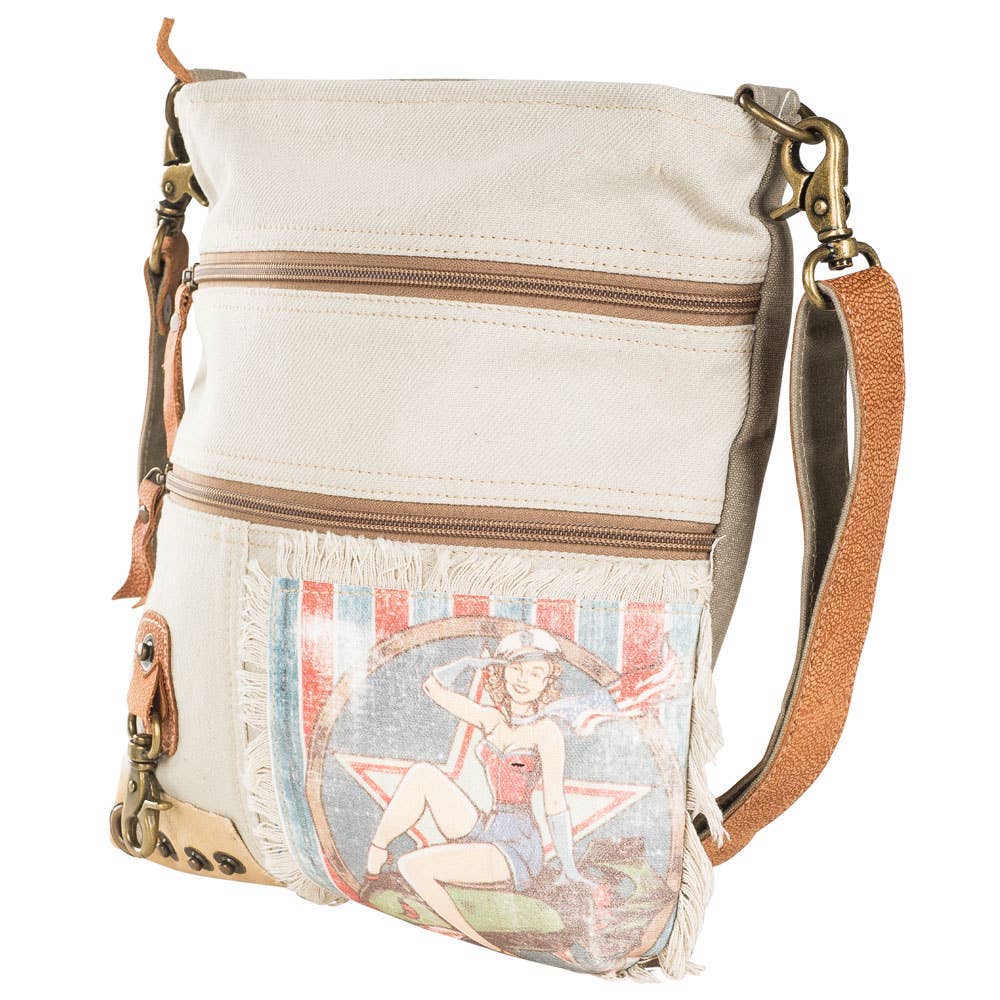Step out in style with the Bomber Pin Up Crossbody Bag from Benjamin International. Crafted with meticulous precision, this accessory measures 10" x 11" x 1.5", perfect for carrying your essentials without feeling bulky. As a testament to our commitment to quality and design, this bag is a seamless blend of functionality and fashion. It's part of our diverse product range, which is both American-made and imported, reflecting our global exposure and commitment to supporting artisans. This crossbody bag is not just a product, but a statement of style, quality, and ethical manufacturing.