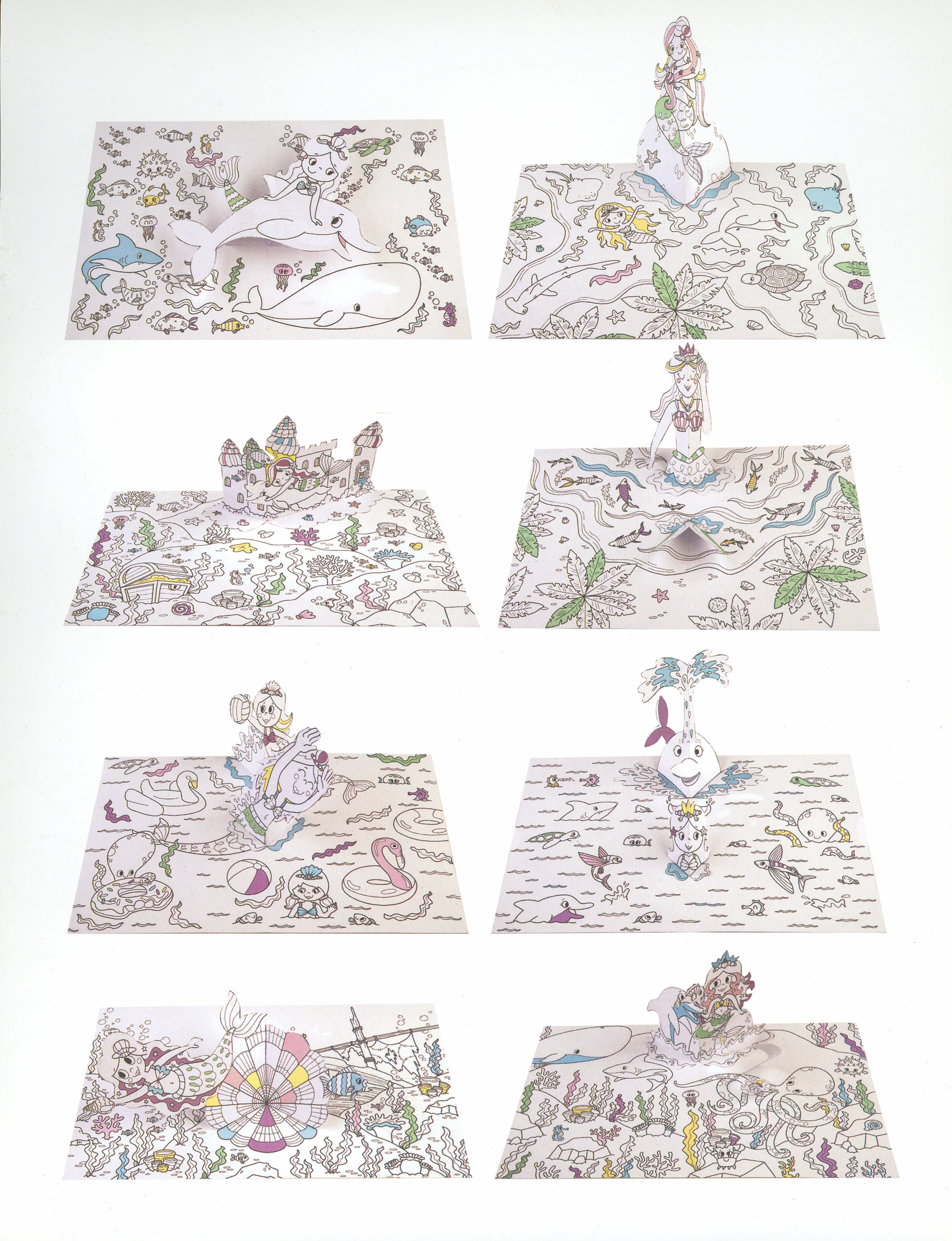 First color the pages and press-out pieces, then follow the instructions to glue the pieces in and create your very own mermaid pop-up book!