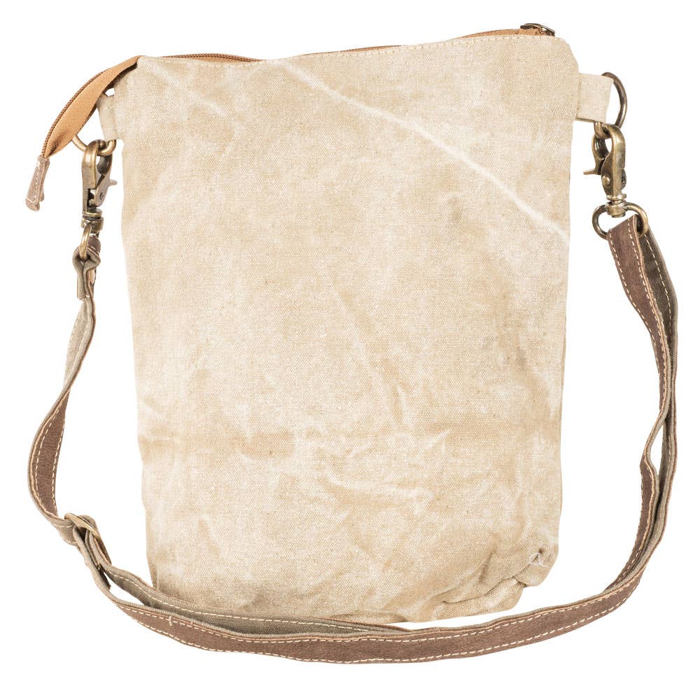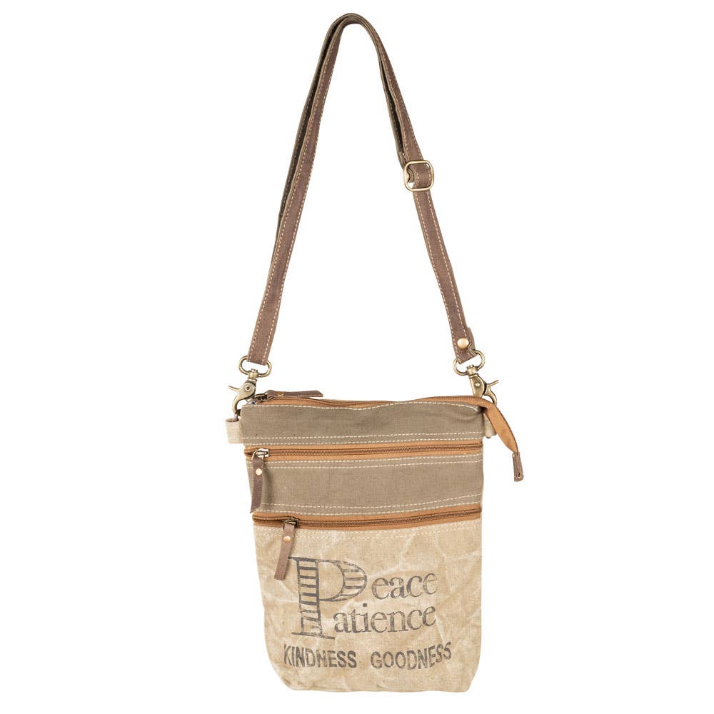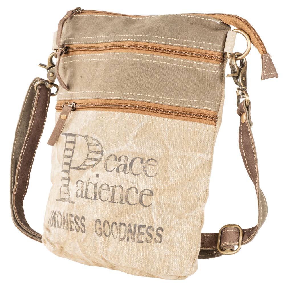 Discover the perfect balance of style and versatility with Clea Ray's Double Zipper Peace Patience Crossbody. This bag, made from repurposed military tent and canvas, offers an adjustable and removable shoulder strap, allowing you to tailor it to your needs. Whether you're navigating the urban jungle or heading out for a weekend getaway, this crossbody bag will keep your essentials secure while adding a touch of rugged elegance to your ensemble. Embrace the beauty of sustainability and practicality with Clea Ray.