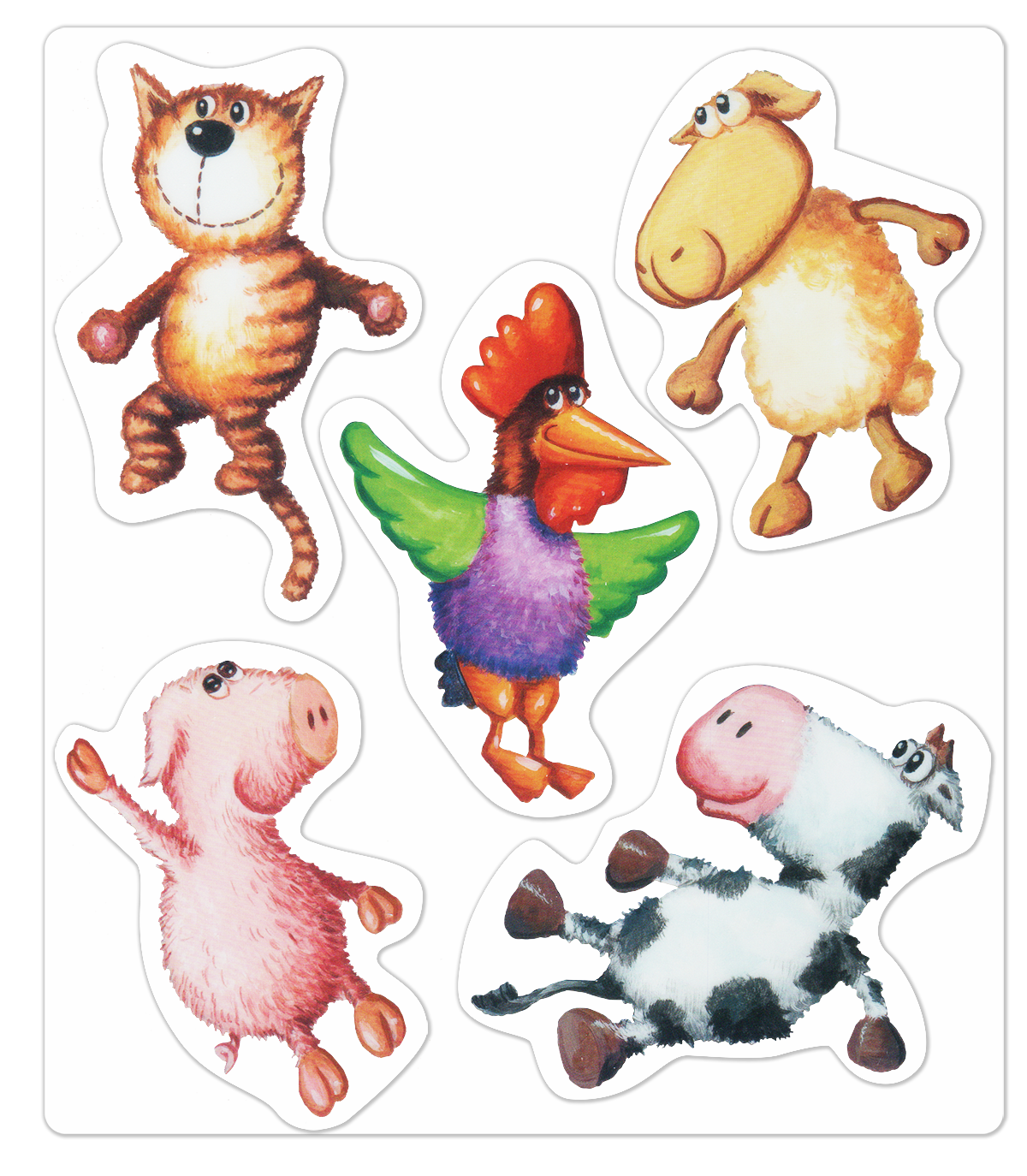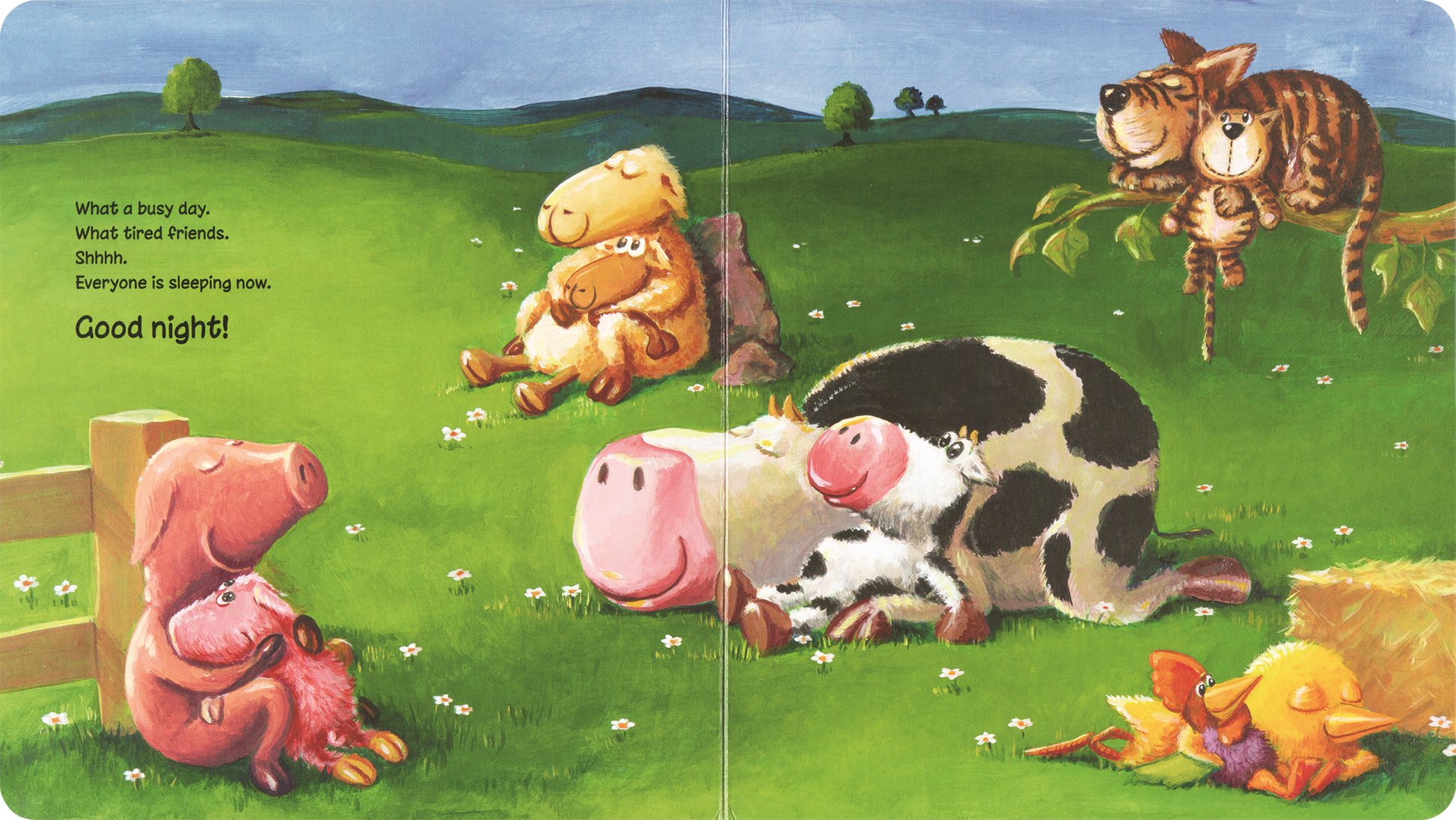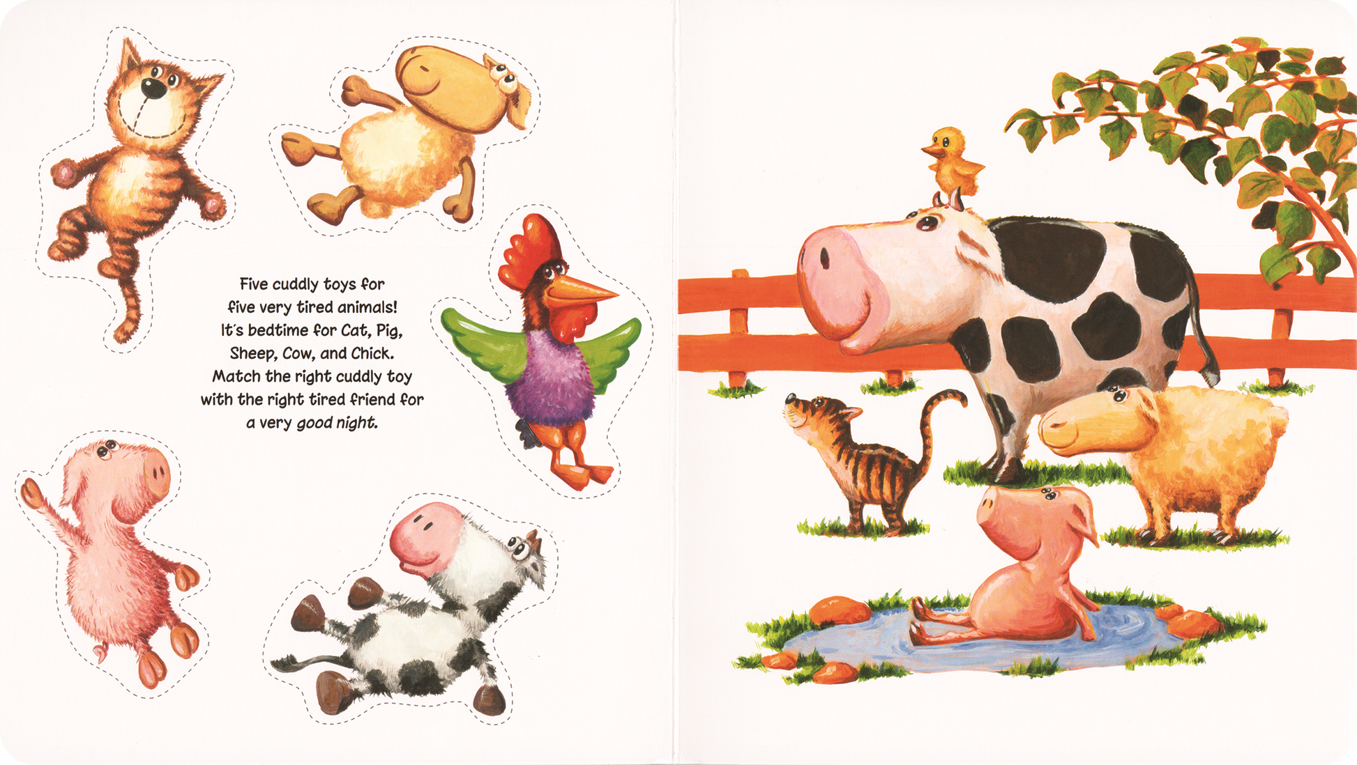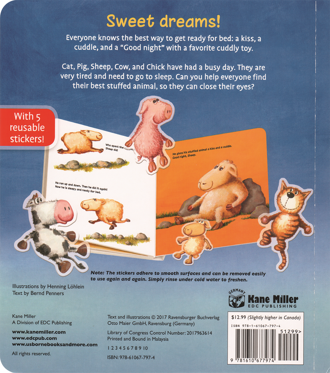 Cat, Pig, Sheep, Cow, and Chick have been busy playing all day, but now it’s time to go to bed. They need kisses, cuddles… and a very special friend before they can say, “Good Night!” Little readers will love helping their friends pick out the perfect stuffed animal for bedtime using the 5 repositionable, reusable stickers.