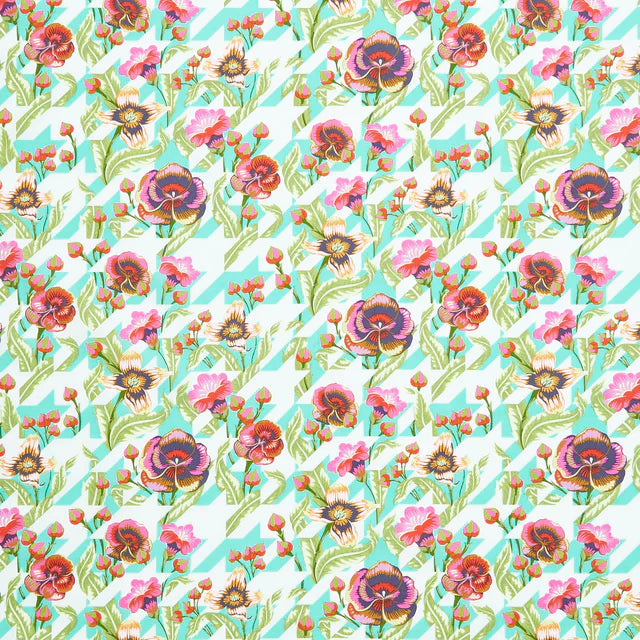 Pink and orange flowers with green leaves tossed on a chunky white and aqua houndstooth background. Tula Pink does it again! Get ready to be wowed by her Untamed collection for Free Spirit Fabrics. This time, your favorite flowers are the stars of the show. With a splash of neon throughout the entire collection, these prints are poppin’! The collection features a gorgeous mix of florals, houndstooth, raindrops, checks, and more. With these fabrics by your side, there’s no limit to what fun projects you can create!